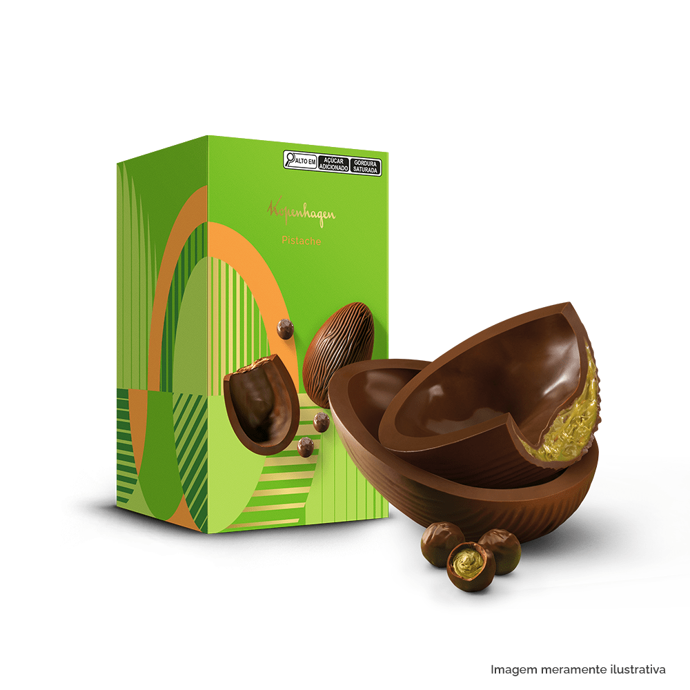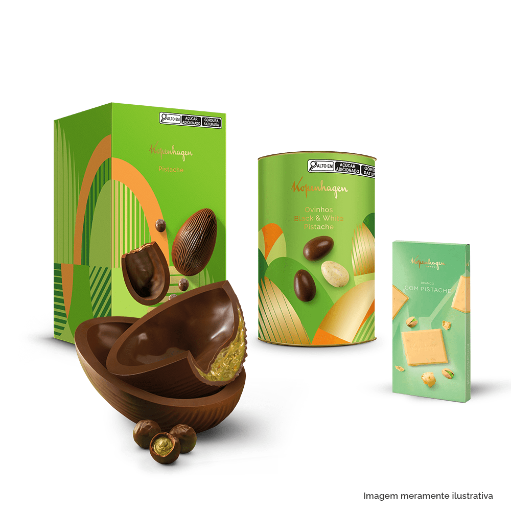 Contém: 1 Ovo de Páscoa recheado Pistache 316G, 1 Ovinhos Black & White Pistache 189G e 1 Tablete Branco com Pistache 100G.