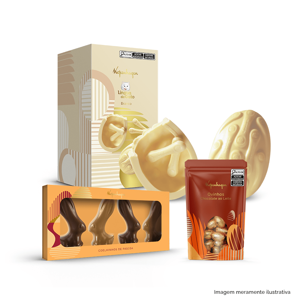 Contém: 1 Ovo de Páscoa Língua de Gato Branco 262G, 1 Pouch Ovinhos de Páscoa ao Leite 180G e 1 Mix Coelhinhos de Páscoa 60G.