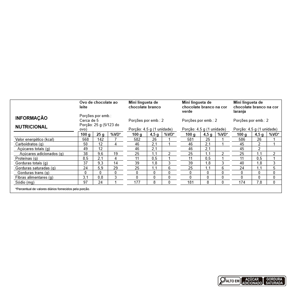 o Ovo de chocolate ao leite Ingredientes: açúcar, leite em pó integral, manteiga de cacau, pasta de cacau, emulsificante lecitina de soja e aromatizante. ALÉRGICOS: CONTÉM DERIVADOS DE LEITE E SOJA. PODE CONTER AMENDOIM, AMÊNDOAS, AVEIA, AVELÃ, CASTANHA-DE-CAJU, CASTANHA-DO-BRASIL, CENTEIO, CEVADA, MACADÂMIA, NOZES, PISTACHE, OVOS E TRIGO. CONTÉM LACTOSE. CONTÉM GLÚTEN. o Mini lingueta de chocolate branco Ingredientes: leite em pó integral, manteiga de cacau, açúcar, soro de leite em pó parcialmente desmineralizado, emulsificante lecitina de soja e aromatizante. ALÉRGICOS: CONTÉM DERIVADOS DE LEITE E SOJA. PODE CONTER AMENDOIM, AMÊNDOAS, AVEIA, AVELÃ, CASTANHA-DE-CAJU, CASTANHA-DO-BRASIL, CENTEIO, CEVADA, MACADÂMIA, NOZES, PISTACHE, OVOS E TRIGO. CONTÉM LACTOSE. CONTÉM GLÚTEN. o Mini lingueta de chocolate branco na cor verde Ingredientes: leite em pó integral, manteiga de cacau, açúcar, soro de leite em pó parcialmente desmineralizado, concentrado de espirulina, corante curcumina, emulsificante lecitina de soja e aromatizante. ALÉRGICOS: CONTÉM DERIVADOS DE LEITE E SOJA. PODE CONTER AMENDOIM, AMÊNDOAS, AVEIA, AVELÃ, CASTANHA-DE-CAJU, CASTANHA-DO-BRASIL, CENTEIO, CEVADA, MACADÂMIA, NOZES, PISTACHE, OVOS E TRIGO. CONTÉM LACTOSE. CONTÉM GLÚTEN. o Mini lingueta de chocolate branco na cor laranja Ingredientes: leite em pó integral, manteiga de cacau, açúcar, soro de leite em pó parcialmente desmineralizado, corante extrato de urucum, emulsificante lecitina de soja e aromatizante. ALÉRGICOS: CONTÉM DERIVADOS DE LEITE E SOJA. PODE CONTER AMENDOIM, AMÊNDOAS, AVEIA, AVELÃ, CASTANHA-DE-CAJU, CASTANHA-DO-BRASIL, CENTEIO, CEVADA, MACADÂMIA, NOZES, PISTACHE, OVOS E TRIGO. CONTÉM LACTOSE. CONTÉM GLÚTEN.
