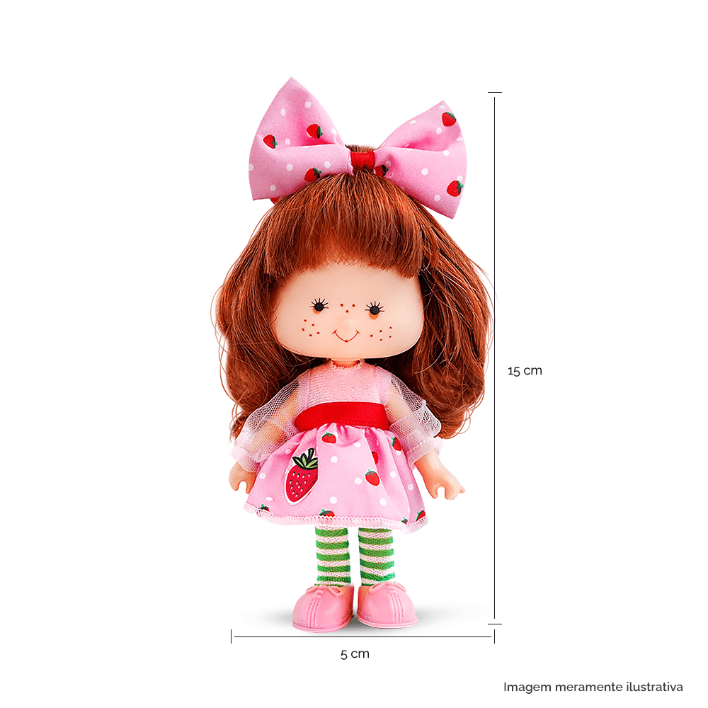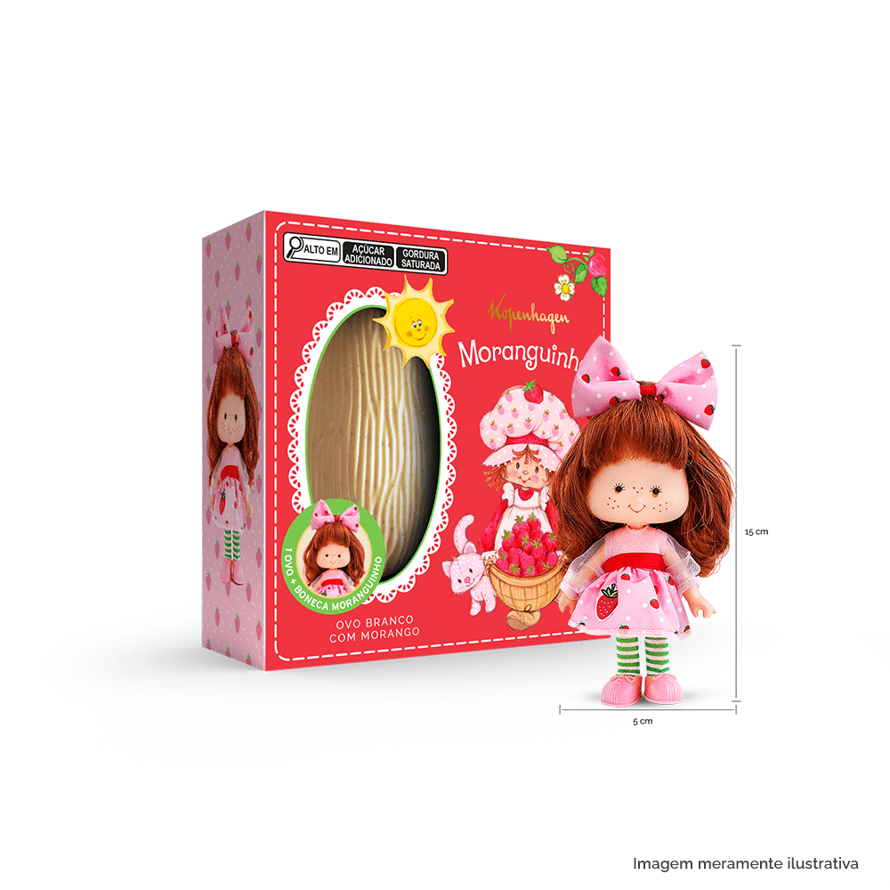 Ovo de chocolate branco com morango. Acompanha uma boneca* Moranguinho, original da Estrela com dimensões aproximadas de 15cm de altura x 5cm de largura.