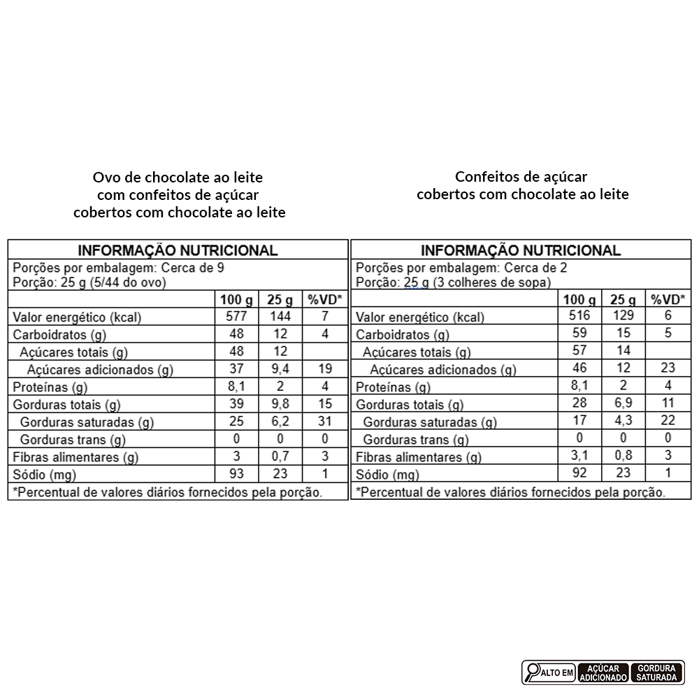 o Ovo de chocolate ao leite com confeitos de açúcar cobertos com chocolate ao leite Ingredientes: açúcar, manteiga de cacau, leite em pó integral, pasta de cacau, confeitos de açúcar (açúcar, dextrina, fécula de mandioca, glicose em pó, glaceante cera de abelhas, antiumectante talco, umectante glicerol e espessante goma arábica), emulsificante lecitina de soja e aromatizante. ALÉRGICOS: CONTÉM DERIVADOS DE LEITE E SOJA. PODE CONTER AMENDOIM, AMÊNDOAS, AVELÃ, CASTANHA-DE-CAJU, CASTANHA-DO-BRASIL, MACADÂMIA, NOZES E PISTACHE. CONTÉM LACTOSE. NÃO CONTÉM GLÚTEN. o Confeitos de açúcar cobertos com chocolate ao leite Ingredientes: açúcar, leite em pó integral, manteiga de cacau, pasta de cacau, confeitos de açúcar (açúcar, dextrina, fécula de mandioca, glicose em pó, glaceante cera de abelhas, antiumectante talco, umectante glicerol e espessante goma arábica), água, antiumectante silicato de magnésio, espessante goma arábica e aromatizante. ALÉRGICOS: CONTÉM DERIVADOS DE LEITE. PODE CONTER AMEN-DOIM, AMÊNDOAS, AVELÃ, CASTANHA-DE-CAJU, CASTANHA-DO-BRASIL, MACADÂMIA, NOZES, PISTACHE E SOJA
