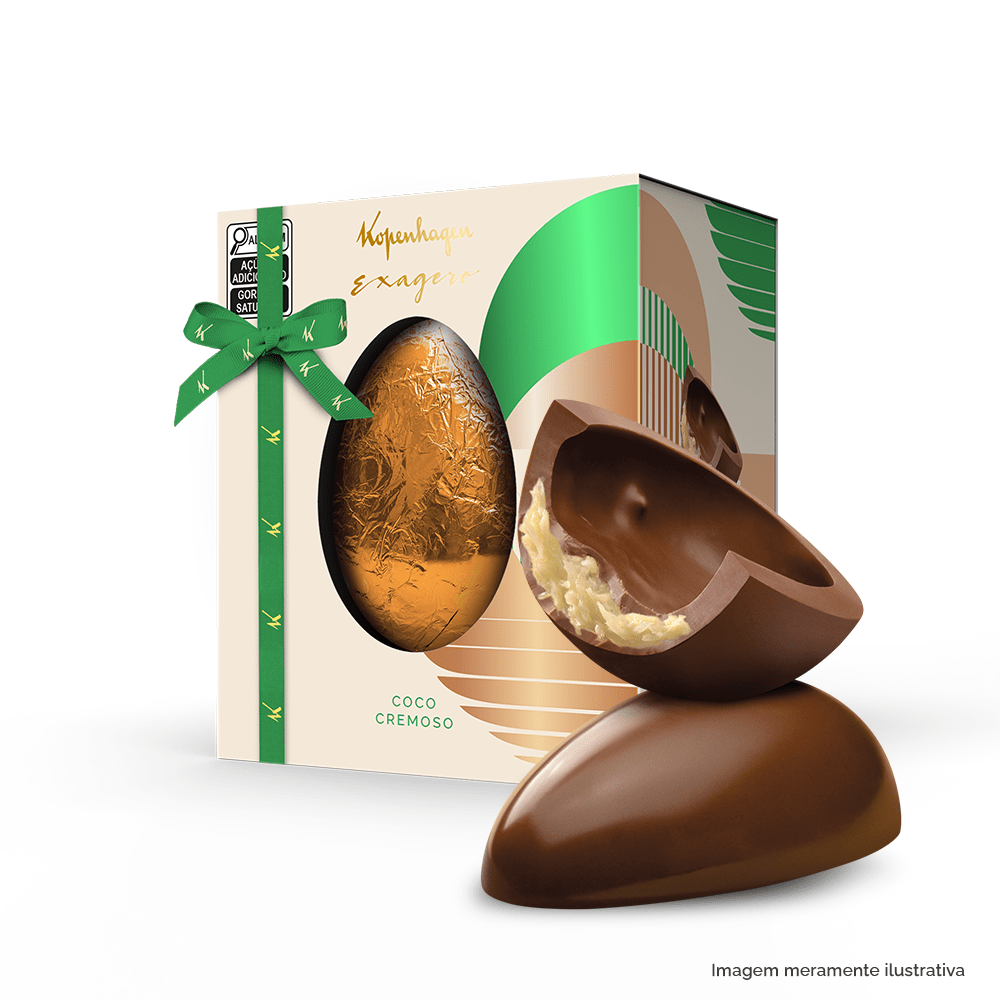 Verdadeiro favorito entre os consumidores, uma combinação perfeita entre chocolate ao leite e coco. Ovo de chocolate ao leite com recheio cremoso com pedaços de coco. Ovos da categoria Exagero tem mais recheio que os ovos tradicionais e oferecem uma experiência ainda mais indulgente.