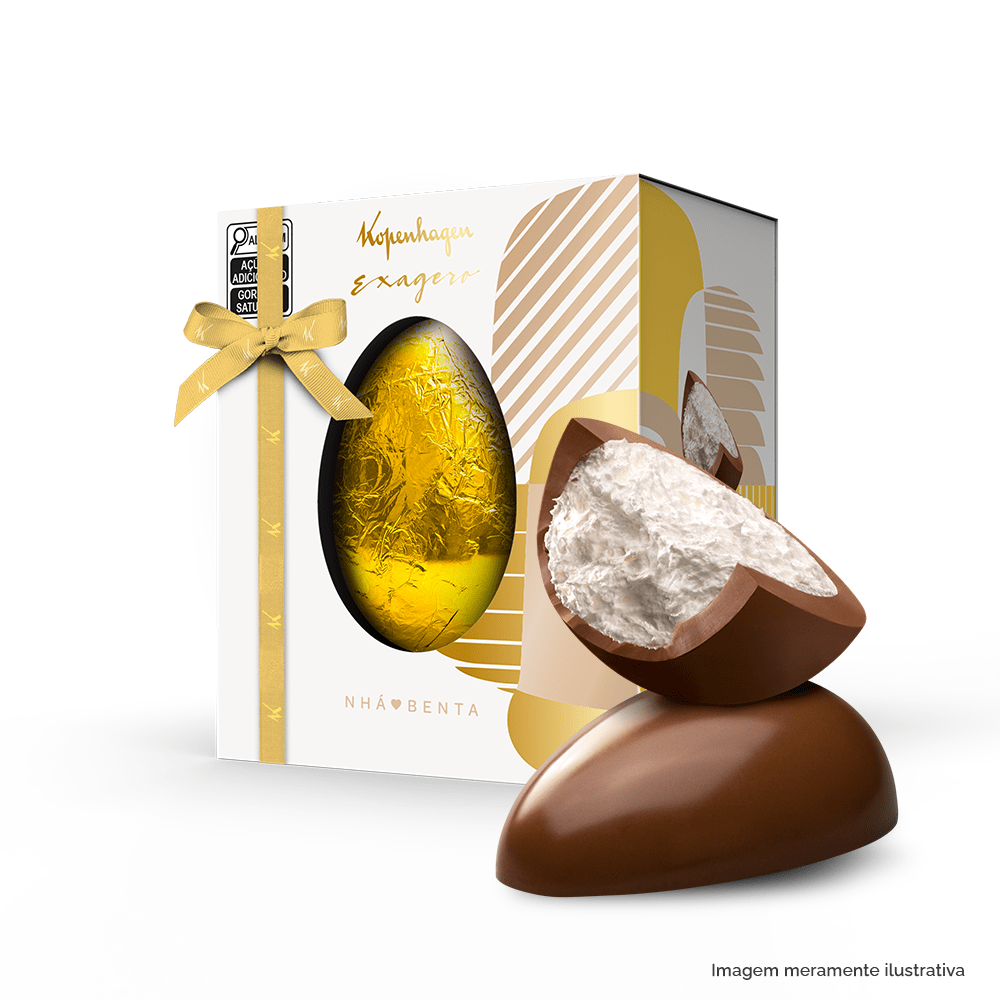 Nosso delicioso e querido Exagero Nhá Benta. Este ovo é uma celebração da combinação clássica e amada de chocolate ao leite com o irresistível recheio de marshmallow. Ovo de chocolate ao leite com recheio de marshmallow. Ovos da categoria Exagero tem mais recheio que os ovos tradicionais e oferecem uma experiência ainda mais indulgente.