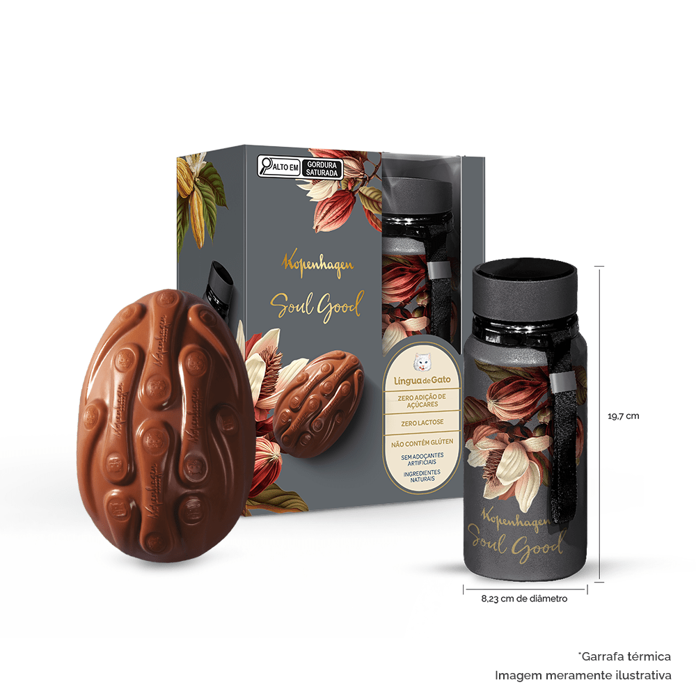 Desenvolvido para atender ao lifestyle moderno e consciente, vem com um brinde exclusivo e é a escolha ideal para quem busca indulgência sem abrir mão da saúde e estilo. Ovo de chocolate ao leite Soul Good para dietas com restrição de lactose e de açúcar, acompanha 6 unidades de chocolate ao leite língua de gato Soul Good e 1 garrafa térmica para líquidos quentes ou frios com capacidade de 600ml e dimensões aproximadas de 19,7cm de altura x 8,23cm de diâmetro. Imagem meramente ilustrativa.
