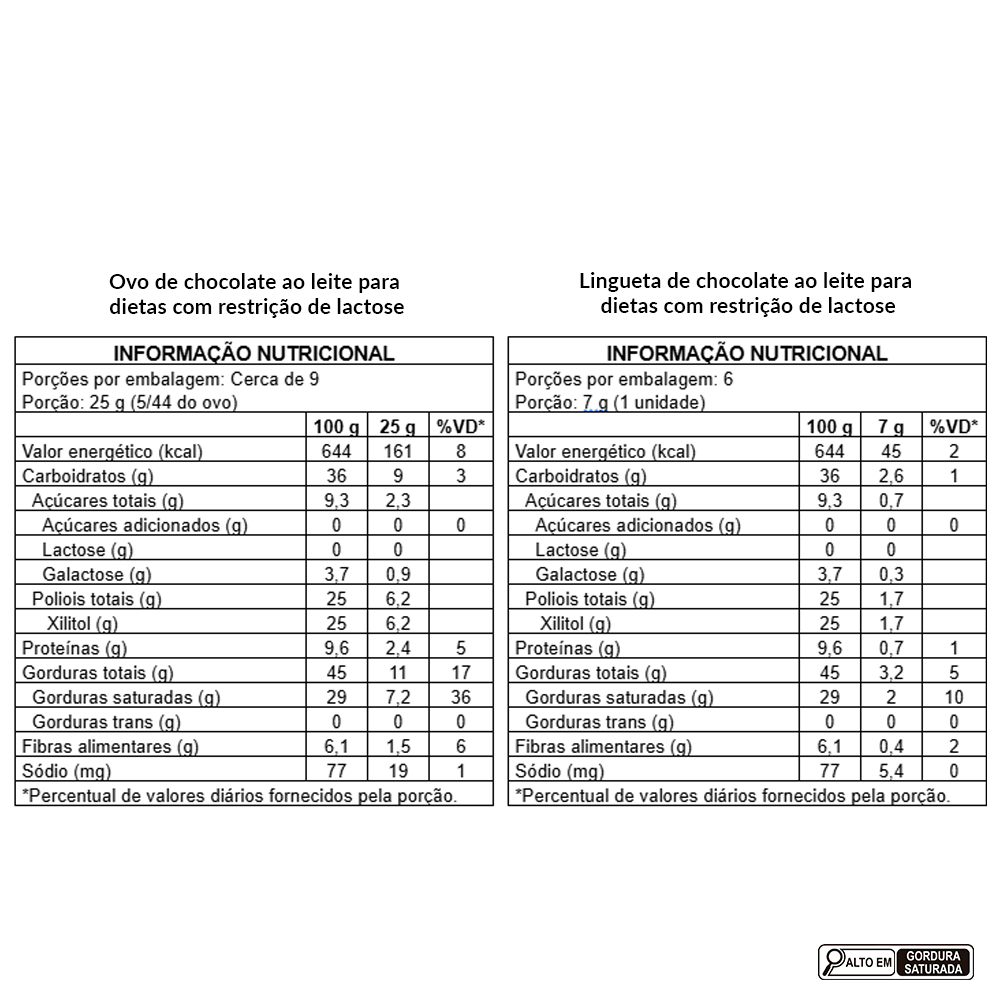 o Ovo de chocolate ao leite para dietas com restrição de lactose Ingredientes: manteiga de cacau, leite em pó integral instantâneo para dietas com restrição de lactose (leite integral, enzima lactase, vitaminas A, C, D e emulsificante lecitina de soja), pasta de cacau, cacau em pó, edulcorante natural maltitol e emulsificante lecitina de soja. ALÉRGICOS: CONTÉM DERIVADOS DE LEITE E SOJA. PODE CONTER AMENDOIM, AMÊNDOA, AVELÃS, CASTANHA-DE-CAJU, CASTANHA-DO-BRASIL, MACADÂMIA, NOZES E PISTACHE. NÃO CONTÉM GLÚTEN. o Lingueta de chocolate ao leite para dietas com restrição de lactose Ingredientes: manteiga de cacau, leite em pó integral instantâneo para dietas com restrição de lactose (leite integral, enzima lactase, vitaminas A, C, D e emulsificante lecitina de soja), pasta de cacau, cacau em pó, edulcorante natural maltitol e emulsificante lecitina de soja. ALÉRGICOS: CONTÉM DERIVADOS DE LEITE E SOJA. PODE CONTER AMENDOIM, AMÊNDOA, AVELÃS, CASTANHA-DE-CAJU, CASTANHA-DO-BRASIL, MACADÂMIA, NOZES E PISTACHE. NÃO CONTÉM GLÚTEN.